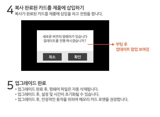 - 파인뷰 홈페이지에서 파일을 다운로드 받은 후 SD카드에 복사 후 블랙박스 재부팅이 되면 자동으로 업데이트 됩니다.