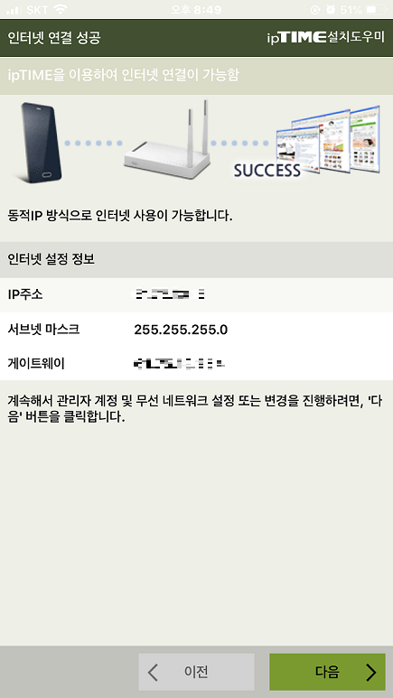 설정이 진행되고 마지막 그림처럼 휴대폰에서 공유기 그리고 인터넷 연결이 SUCCESS 되었네요 ㅋㅋ