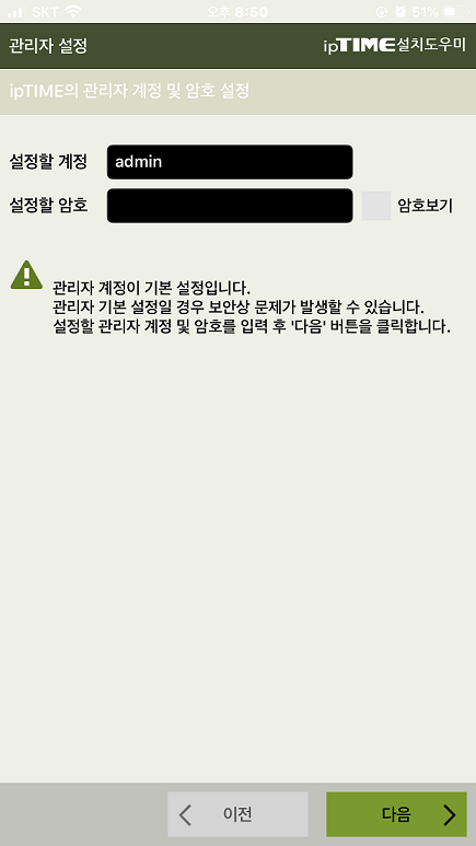 ipTIME Mobile 어플 실행시 로그인계정과 암호는
