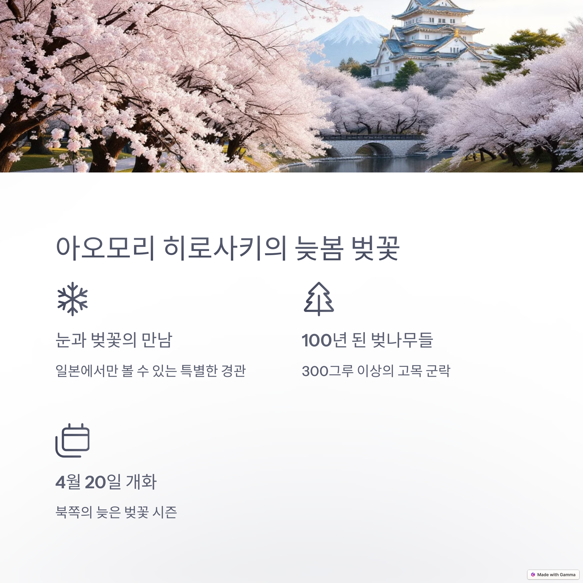 | 추천 명소 | 도쿄 우에노공원, 오사카 오카와강, 교토 철학의 길 등 |