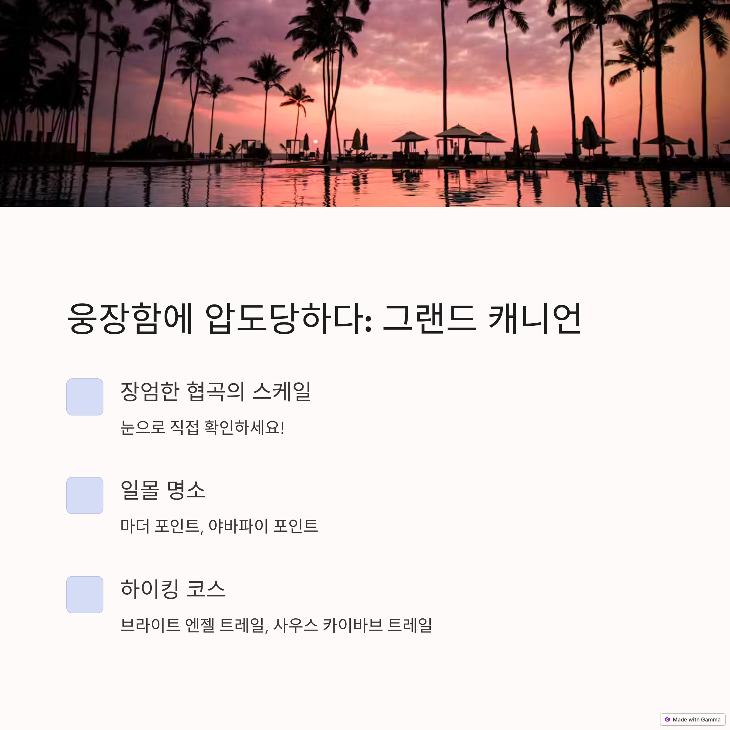 미국 서부 여행의 필수 코스, 잘 보셨나요? 그랜드 캐니언의 웅장한 협곡, 요세미티의 맑은 폭포, 그리고 라스베이거스의 화려한 밤은 여러분의 가슴을 뛰게 할 거예요. 저는 요세미티에서 자전거를 타며 폭포 소리를 들었던 순간이 아직도 생생한데, 여러분은 어떤 장소가 가장 기대되시나요? 이 코스들은 자연과 문화를 동시에 느낄 수 있는 완벽한 조합이에요. 여행은 새로운 나를 발견하는 시간입니다. 지금 바로 계획을 세워, 렌터카를 타고 광활한 서부로 떠나보세요! 여러분의 여행 이야기도 댓글로 들려주시면 정말 기쁠 거예요. 어디로 먼저 가고 싶으신가요? 함께 공유해 봐요!