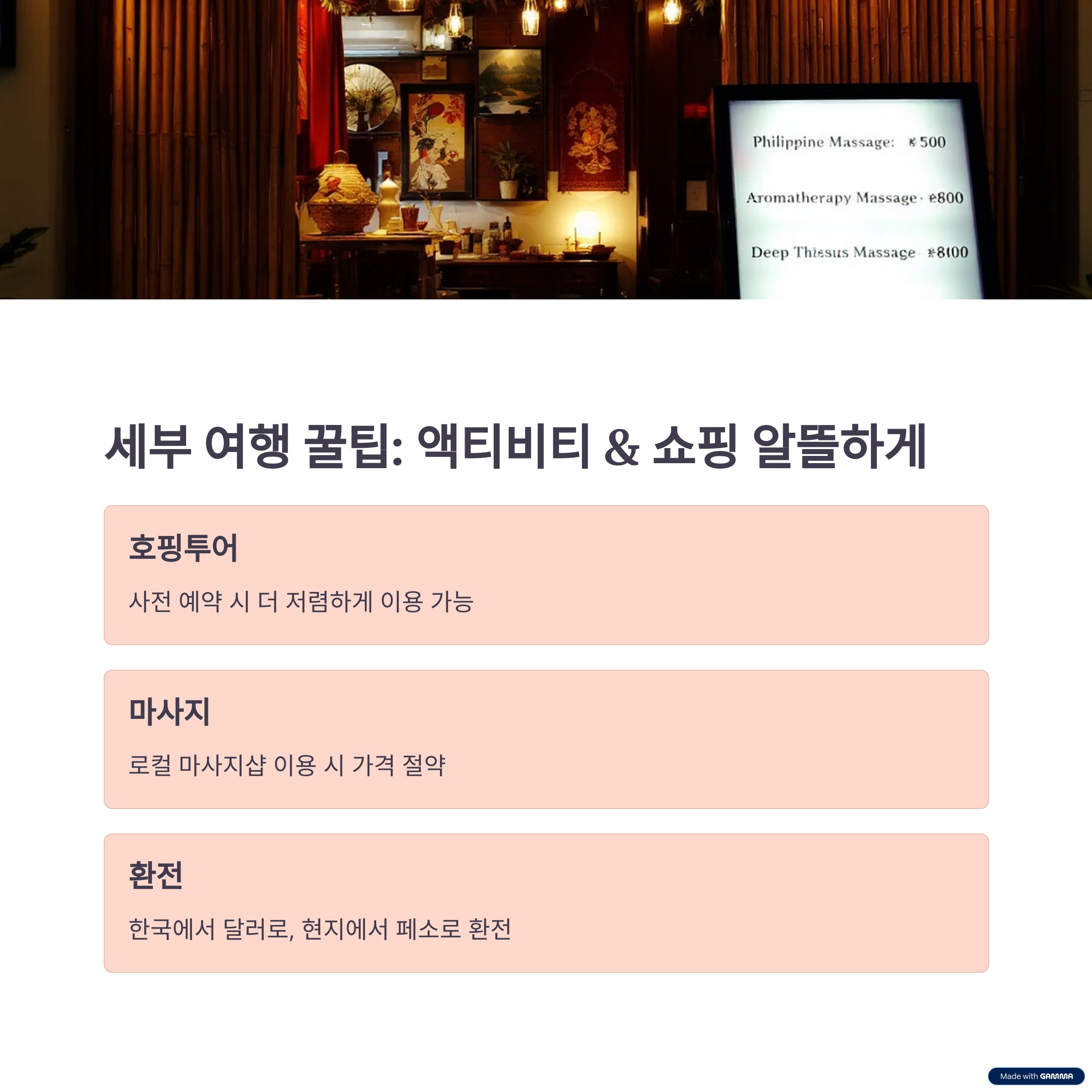 마지막으로 필리핀 세부를 소개합니다. 세부는 가성비 좋은 호핑투어와 저렴한 마사지로 여행자들에게 사랑받는 곳입니다. 보홀 근처의 섬 투어는 한 명당 30,000원 정도로 즐길 수 있어요. 저는 세부에서 현지 마사지를 10,000원에 받아보고 그 퀄리티에 정말 놀랐던 기억이 있답니다. 또한, 세부의 바다에는 고래상어 투어 같은 독특한 경험이 기다리고 있어요. 맑은 바다에서 스노클링하며 보낸 시간은 잊을 수 없는 추억이 되었습니다.