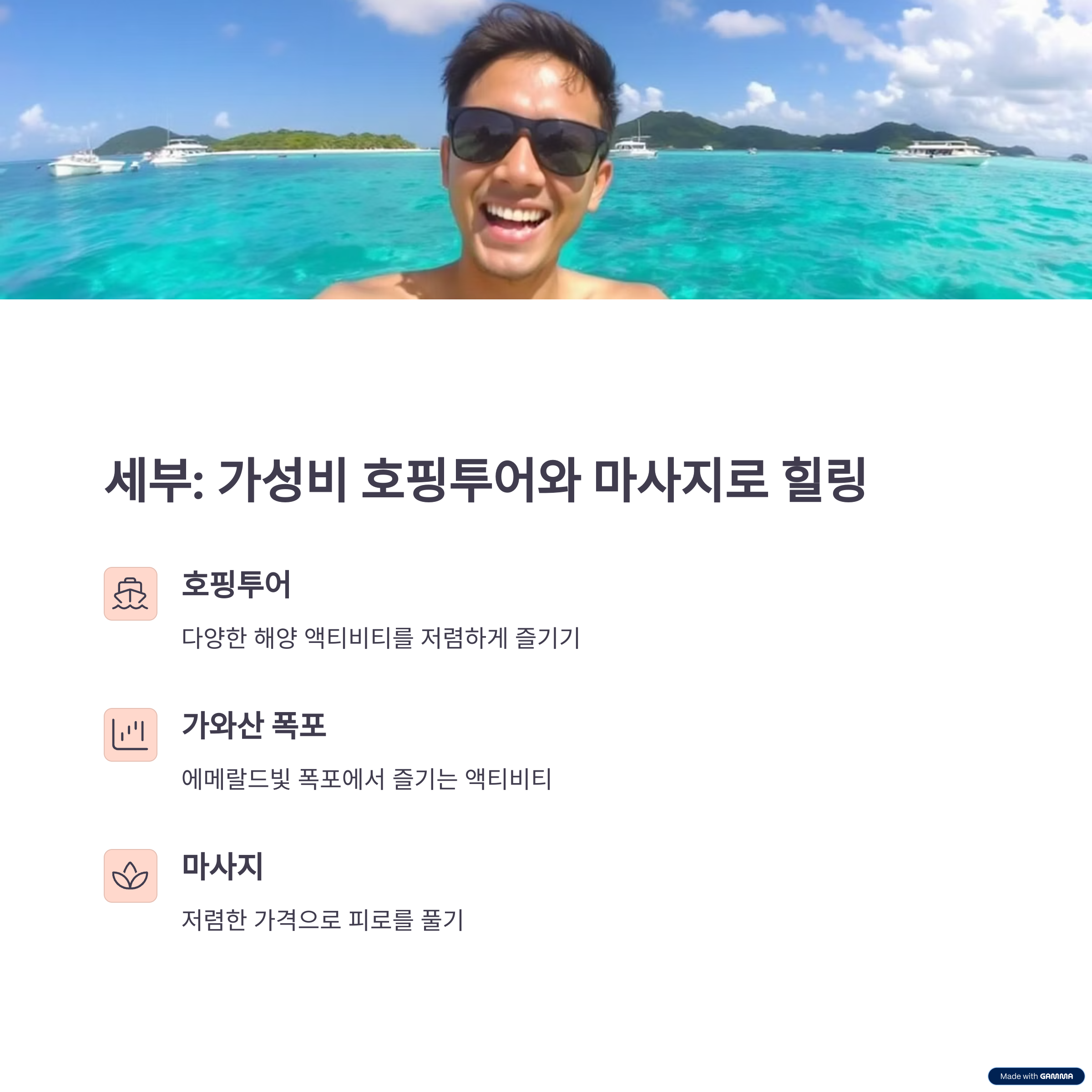| 저렴한 물가, 아름다운 해변 | 다양한 먹거리, 활기찬 야시장 | 가성비 호핑투어, 저렴한 마사지 |
