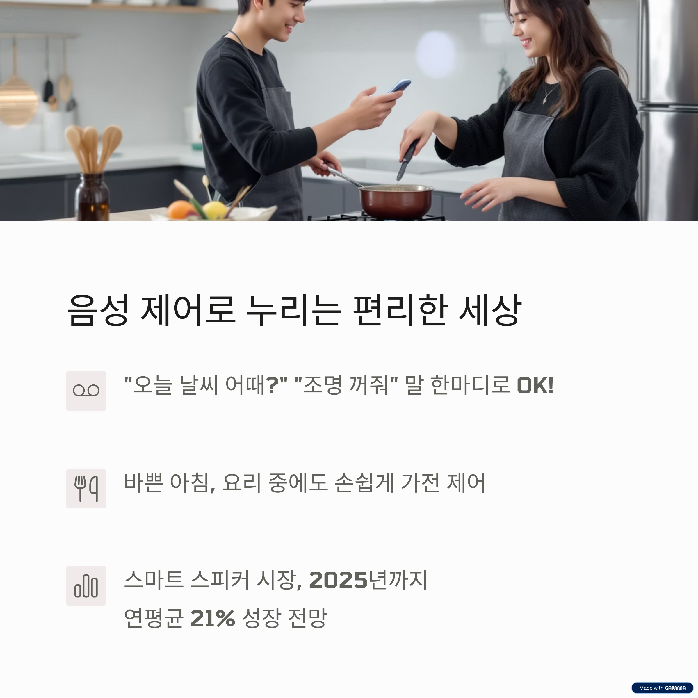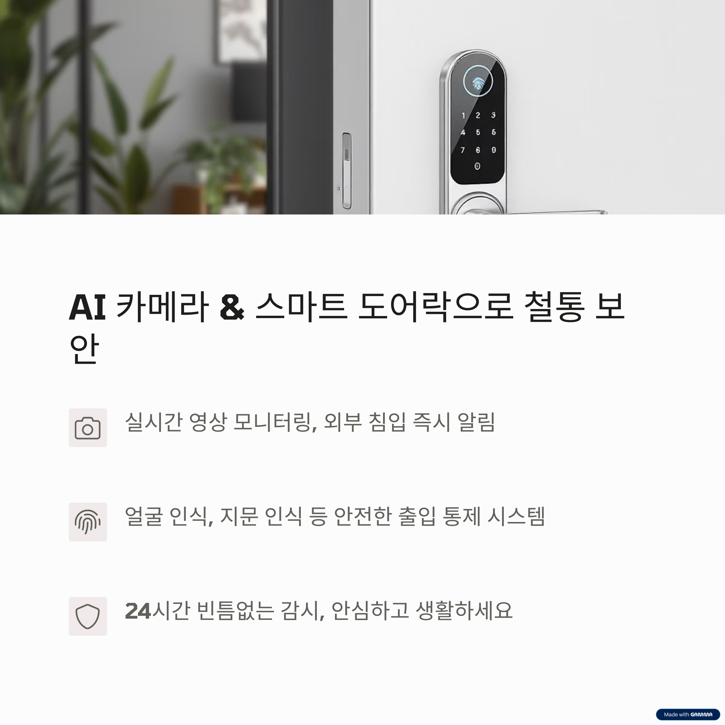 | 음성 제어로 일상 효율성 향상 | 사용 패턴 학습으로 전력 최적화 | 이상 행동 감지 및 원격 제어 |