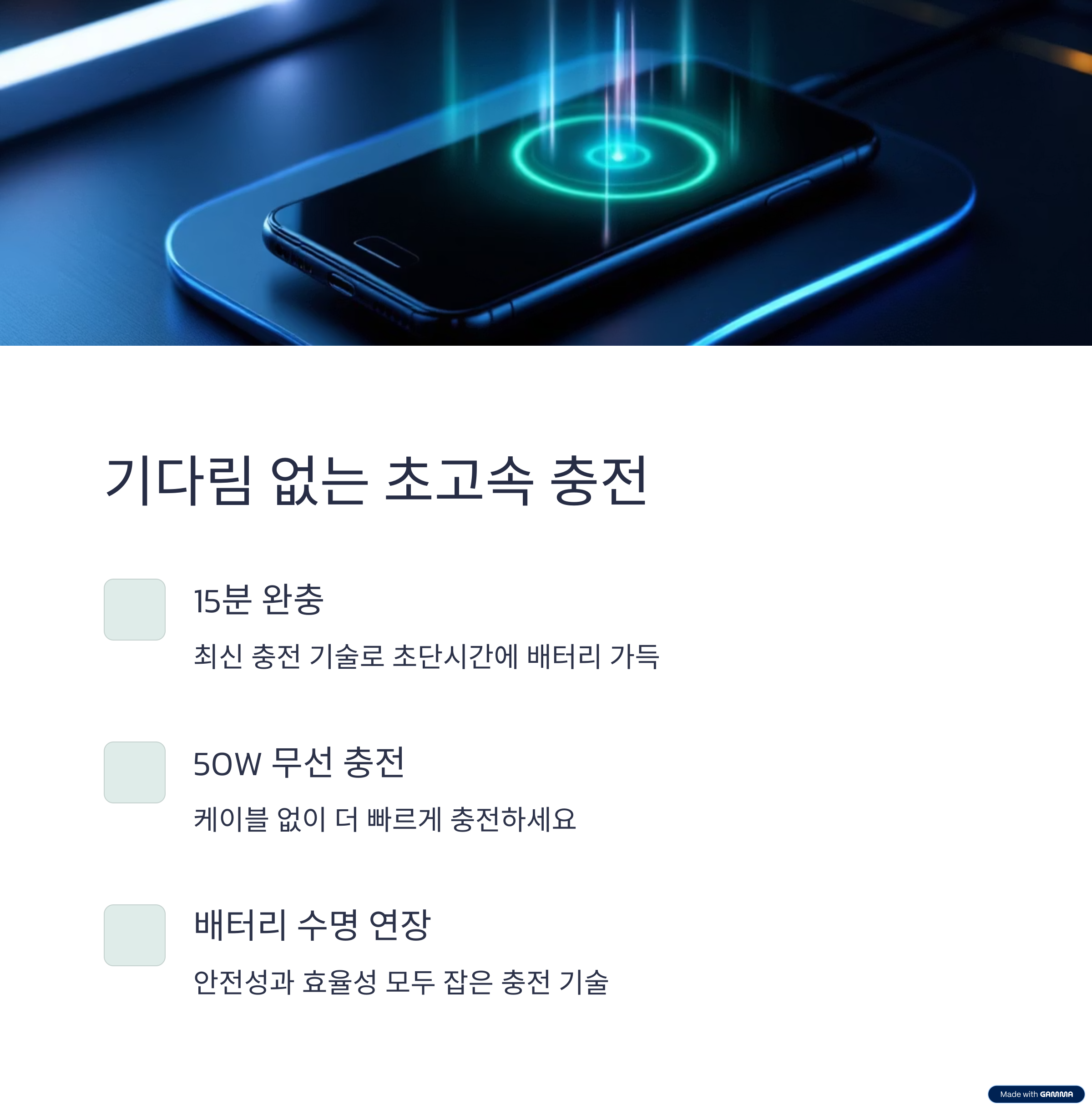 | 초고속 충전 | 15분 만에 100% 완충 가능한 신기술 적용 |