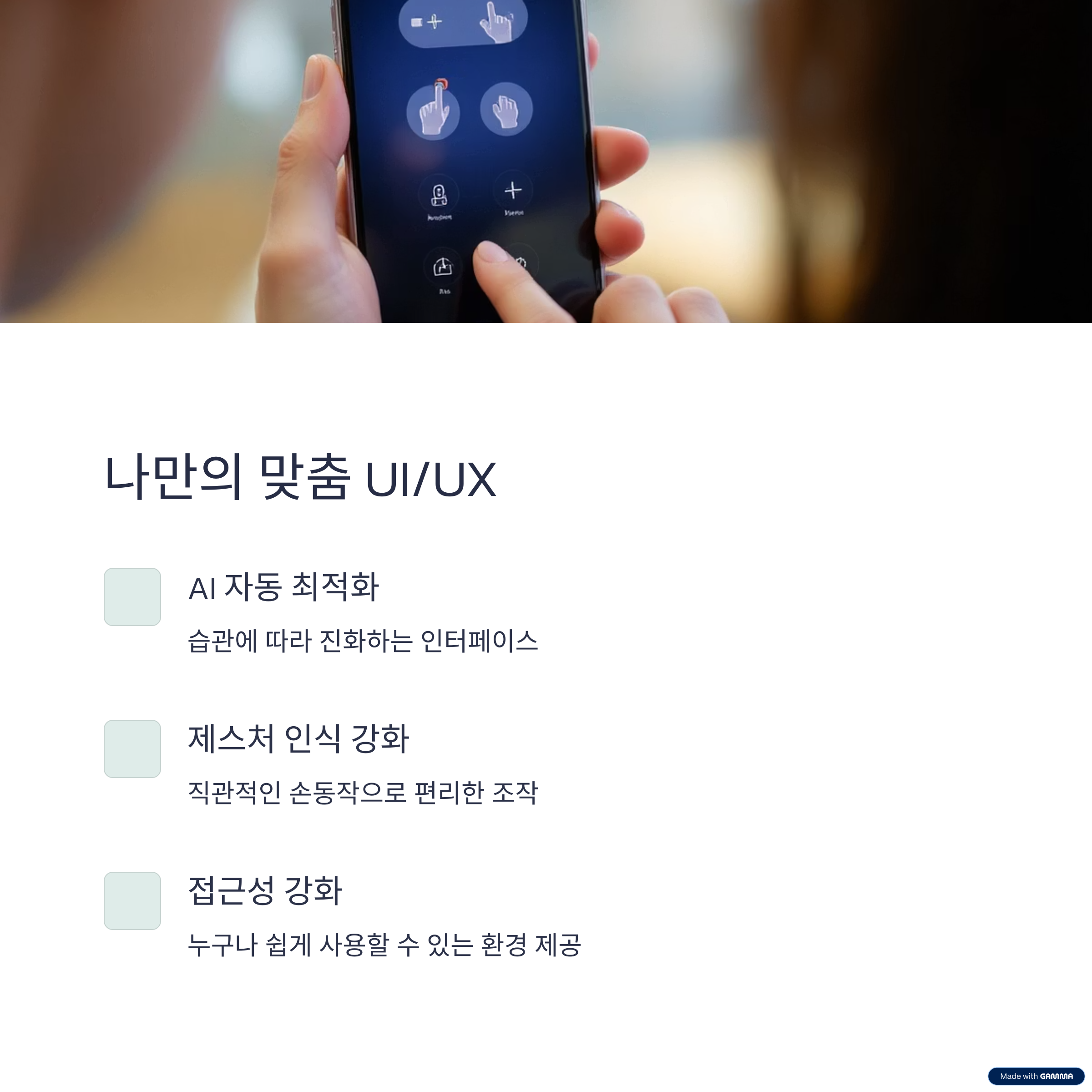| 맞춤형 UX 최적화 기능 포함 | 무선 충전 효율성 향상 | 위치 기반 보안 및 자동 암호화 |