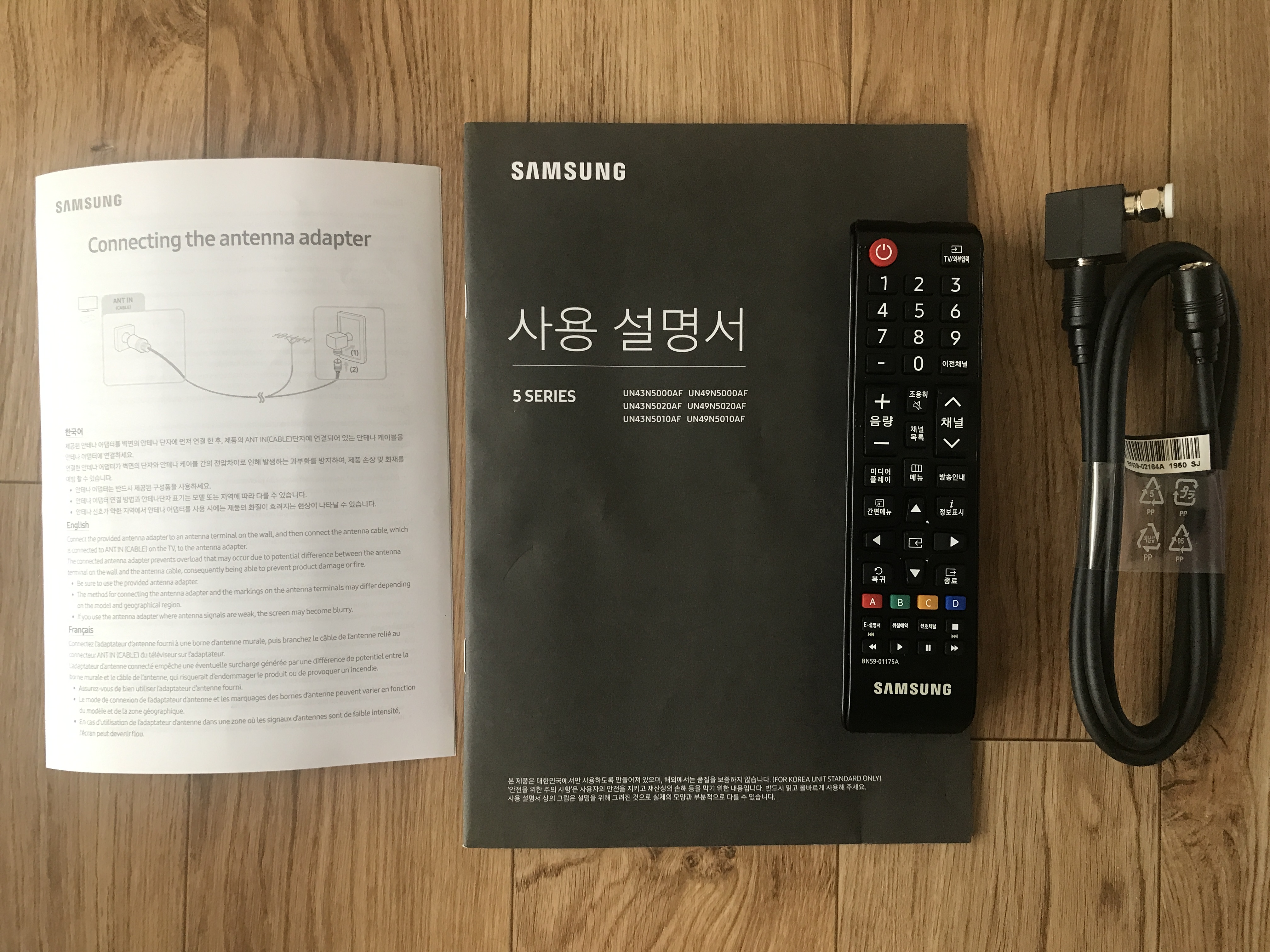 설명서와 리모컨, 그리고 안테나 선이 있습니다.