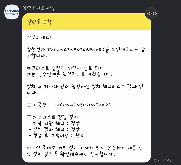 그러면 구입감사 글과 함께 설치일자가 확정됩니다.
