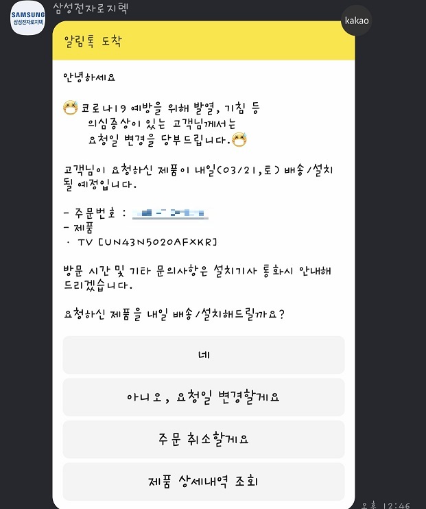 그러면 구입감사 글과 함께 설치일자가 확정됩니다.