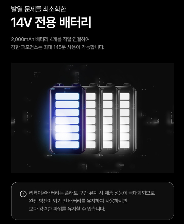 강풍으로 연속 사용하면 소모가 빠르지만, 일반적인 청소 용도로는 충분히 오래 사용할 수 있었습니다.
