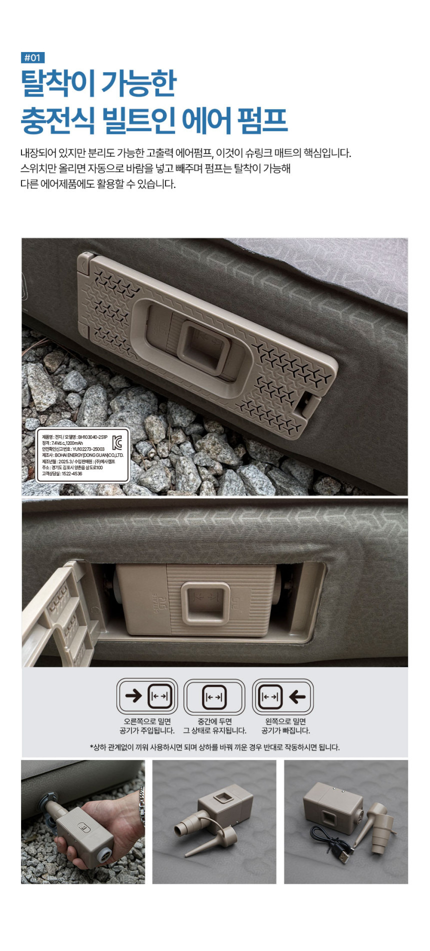 그래서 이번에는 충전식 빌트인 에어펌프가 들어 있는 자충매트를 고르게 됐습니다.