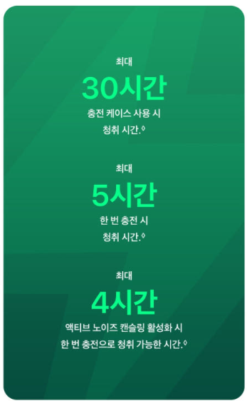 액티브 노이즈 캔슬링이 강화되어 불필요한 소음이 크게 줄고, 낮은 볼륨에서도 선명한 음질을 들을 수 있었습니다.